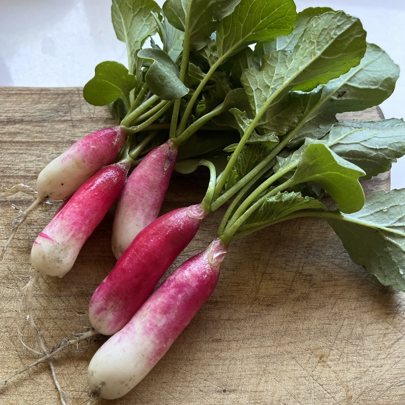 El rábano french, como yo lo llamo para acortar el nombre, es una de las más de 100 variedades de rábano. Tiene una apariencia similar al familiar bola rosa típico, pero en lugar de una forma bulbosa, es alargada con hojas verdes comestibles en la parte superior. El sabor es delicado, no tan picante con toques de pimienta suave y una textura crujiente. A menudo se come crudo, es probable que estos rabanitos se encuentren en mercados gourmet franceses.